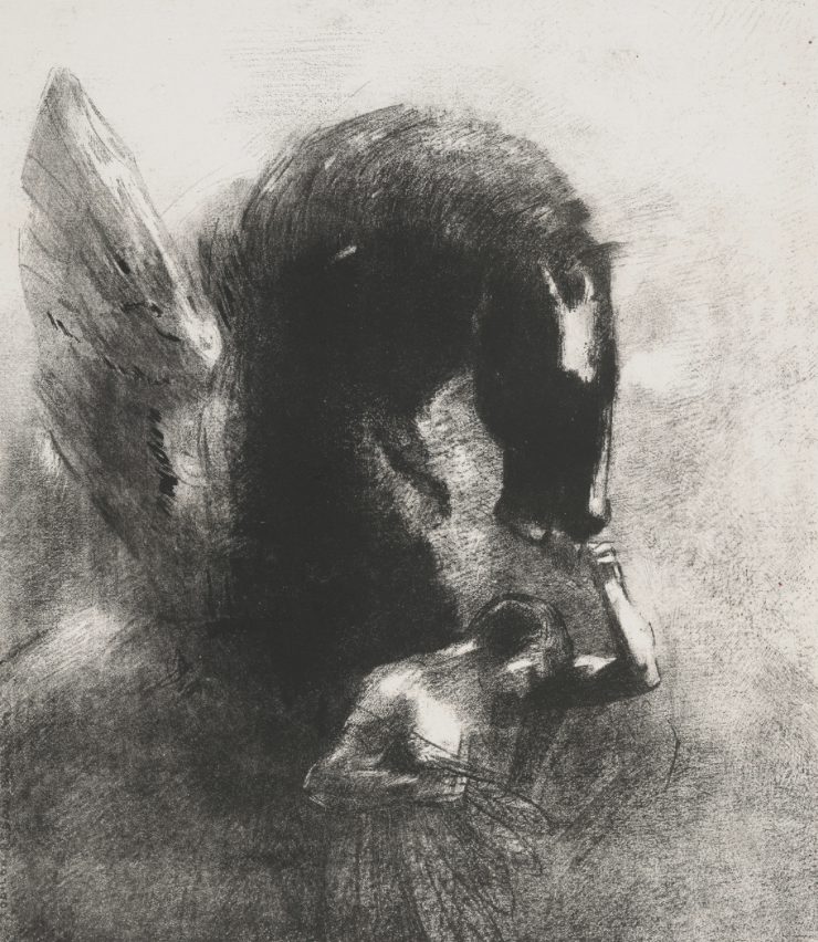 Odilon Redon. Captive Pegasus (Pégase captif). 1889, published 1891 Paris, probably by the artist. Edition of 100, fewer printed. Lithograph with chine appliqué, composition: 13 3/8 x 11 5/8″ (34 x 29.5 cm); sheet: 20 x 15 13/16″ (50.8 x 40.1 cm). Lillie P. Bliss Collection, MoMA New York